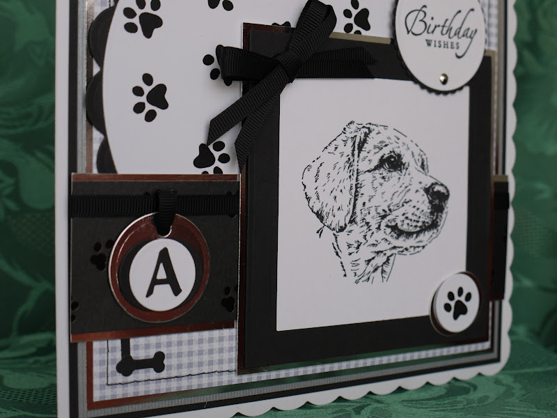 This is a card I've made for Amanda, my cousin's daughter, who is fifteen today. The family have two labrador dogs which they dote on so I decided to use this as the theme for her card. The main image is from Joanna Sheen's rubber stamp sheet Labrador Retriever and is stamped with Memento Black Tuxedo ink on to white card. Spellbinders square nestabilities dies were used to create a frame for it with a layer of silver mirri card underneath. Spellbinders circle dies were used to cut out a paw print embellishment, layers for the tag, backing paper layers and also the sentiment. Quickutz dies were used to cut the A for Amanda and the bones to make the corners and Stampin up black grosgrain ribbon was used for the bow and the stamped sentiment was from their Sincere Salutations set.